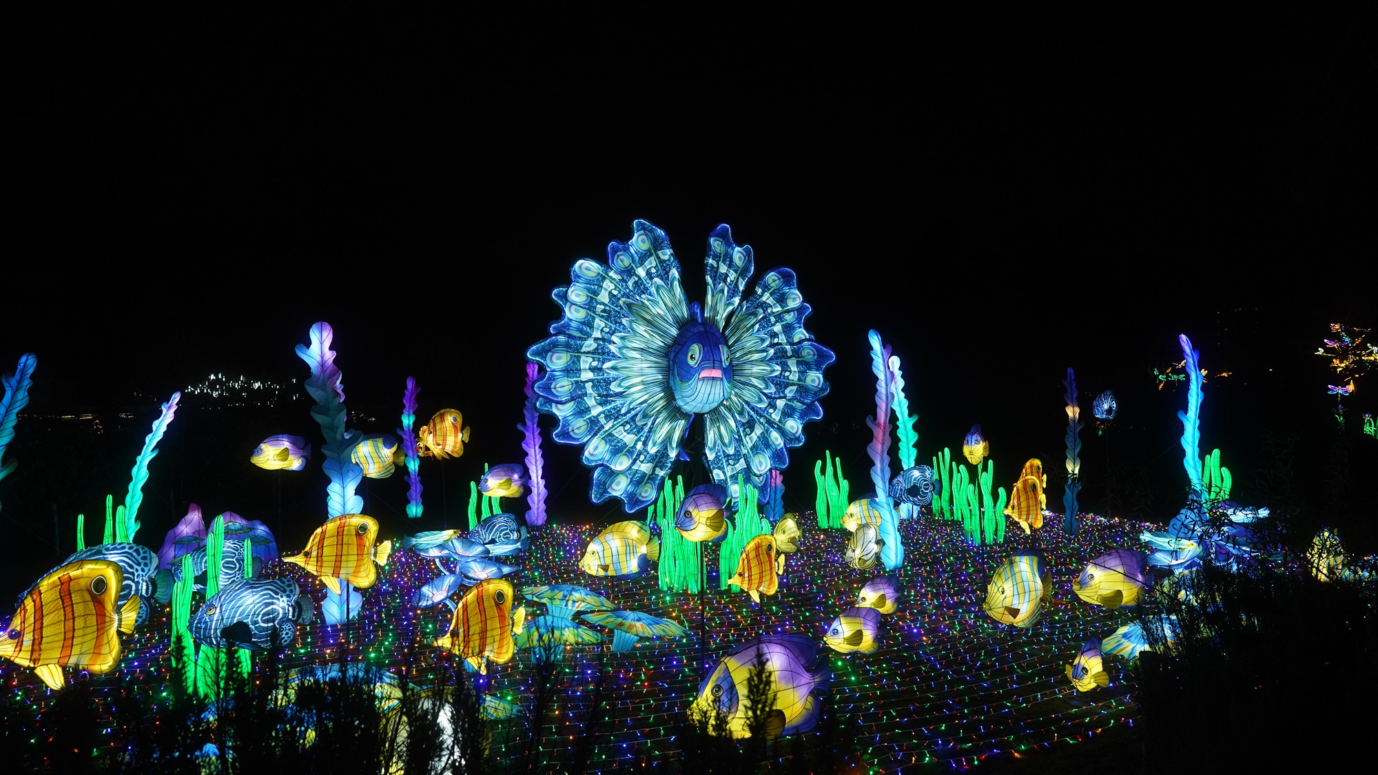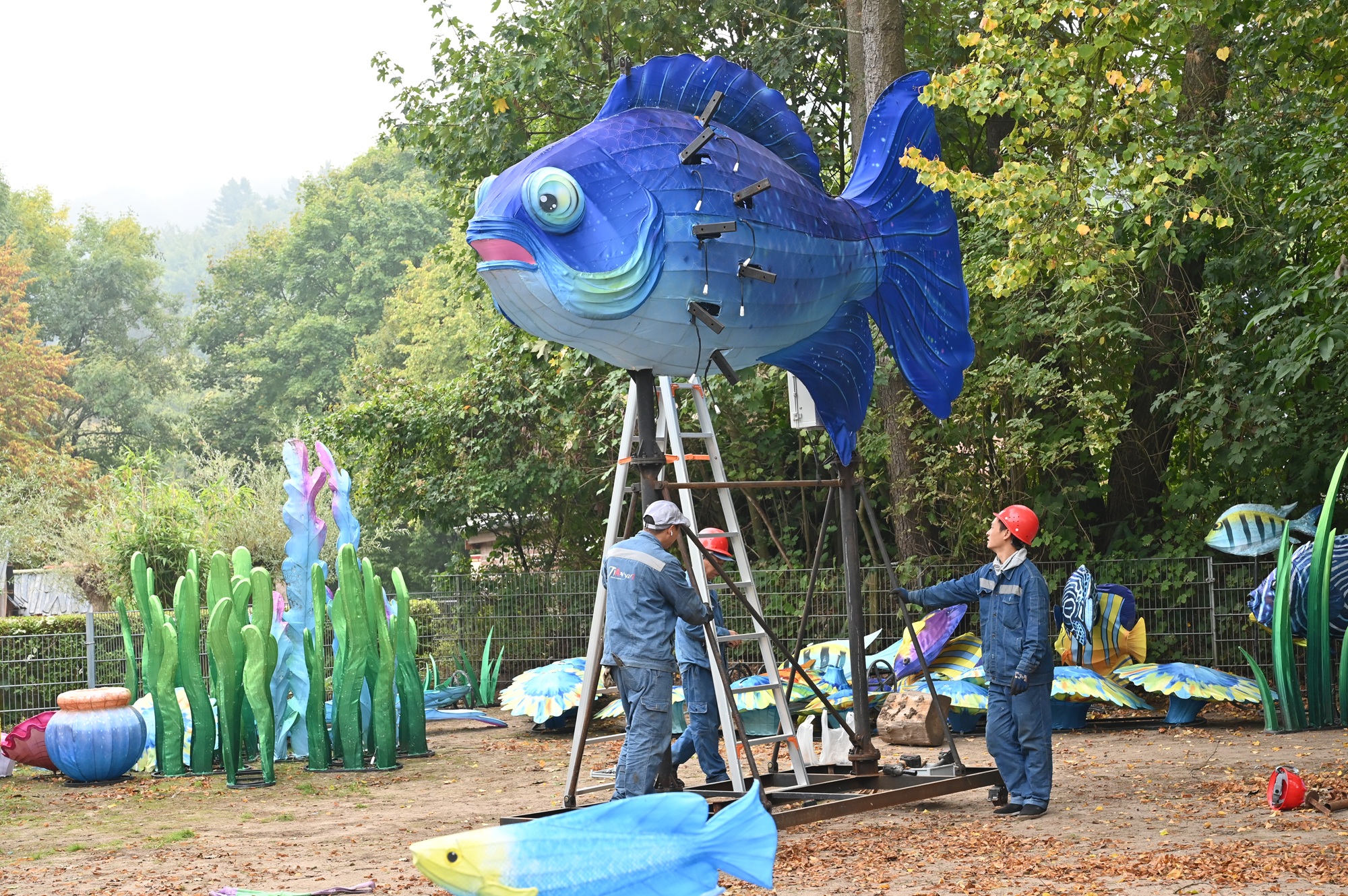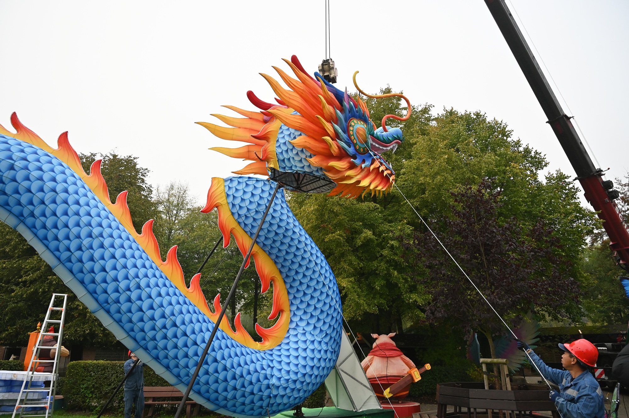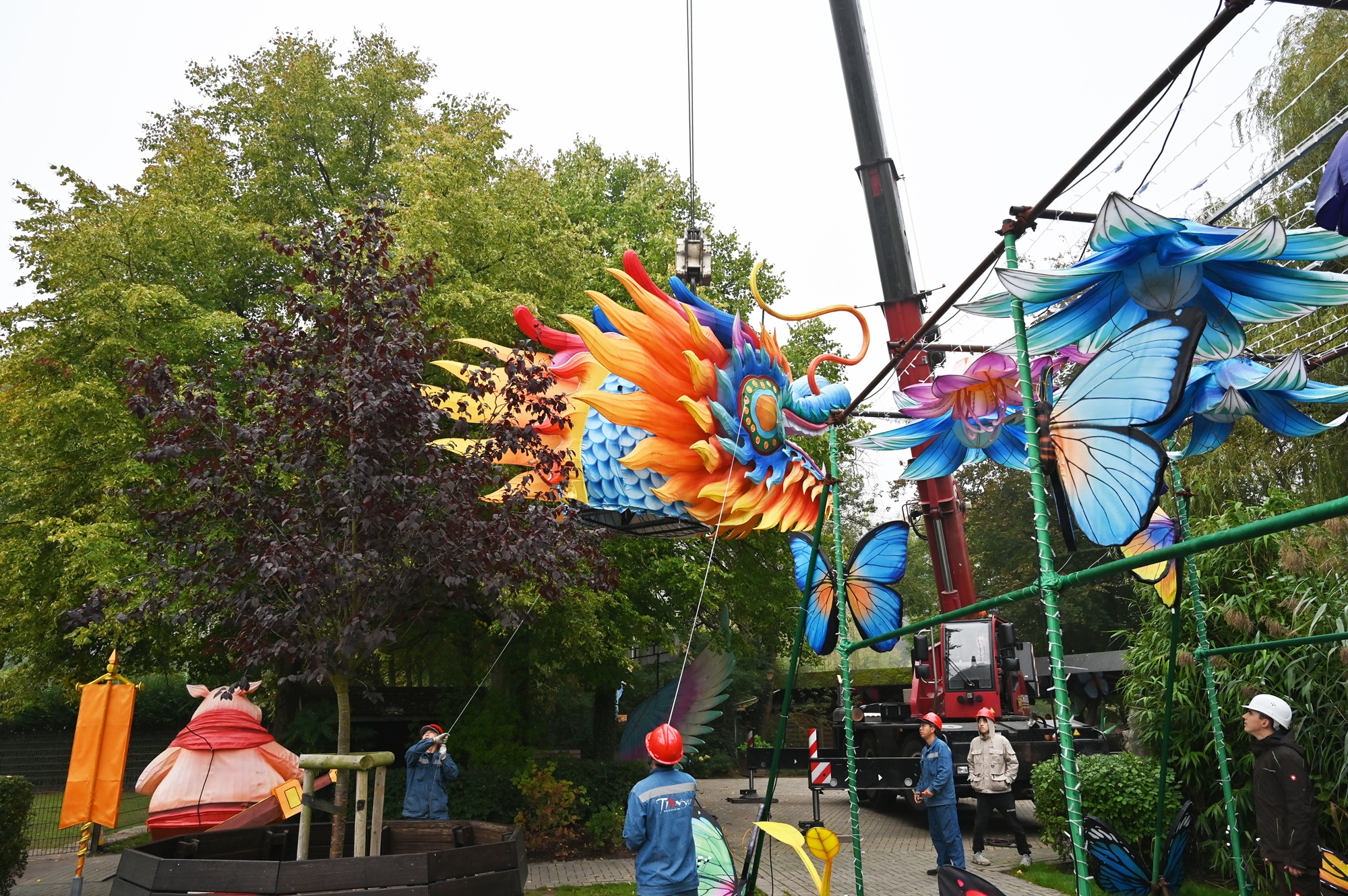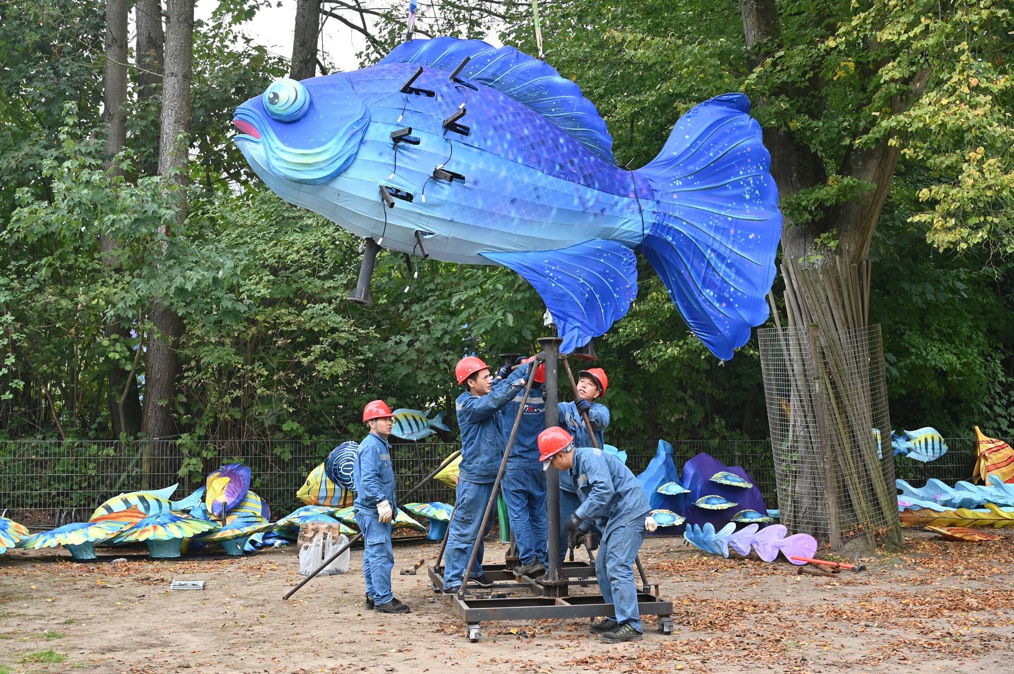 Der Aufbau der diesjährigen China Lights im Tiergarten Kleve geht in die finale Phase. Seit mittlerweile anderthalb Monaten sind 14 chinesische Laternenkünstler damit beschäftigt, die fantasievollen Lichtinstallationen im Tiergarten zu errichten. Am 30. September wurde mit Hilfe eines Schwerlastkrans der rund 300 Kilogramm schwere Drachenkopf an seine vorgesehene Stelle gehoben und komplettiert den 30 Meter langen Riesendrachen, der eines der spektakulären Highlights der diesjährigen Lichtershow darstellt. Ebenfalls per Kran wurde ein beeindruckender Feuerfisch platziert, der die Gäste während der China Lights in eine farbenprächtige Unterwasserwelt entführt. „Mit dem Riesendrachen und dem Feuerfisch haben wir zwei absolute Publikumsmagnete geschaffen, die den Besucherinnen und Besuchern unvergessliche Momente bescheren werden“, freut sich Tiergartenleiter Martin Polotzek.